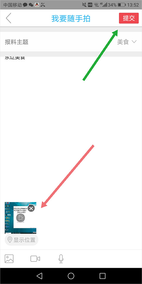 5、选择好视频后,会自动返回到上一步的页面,用户可以发现此时的页面底部会出现刚才上传的视频文件了(下图红色箭头所指),用户只需要点击右上角的【提交】(下图绿色箭头所指)即可上传视频了