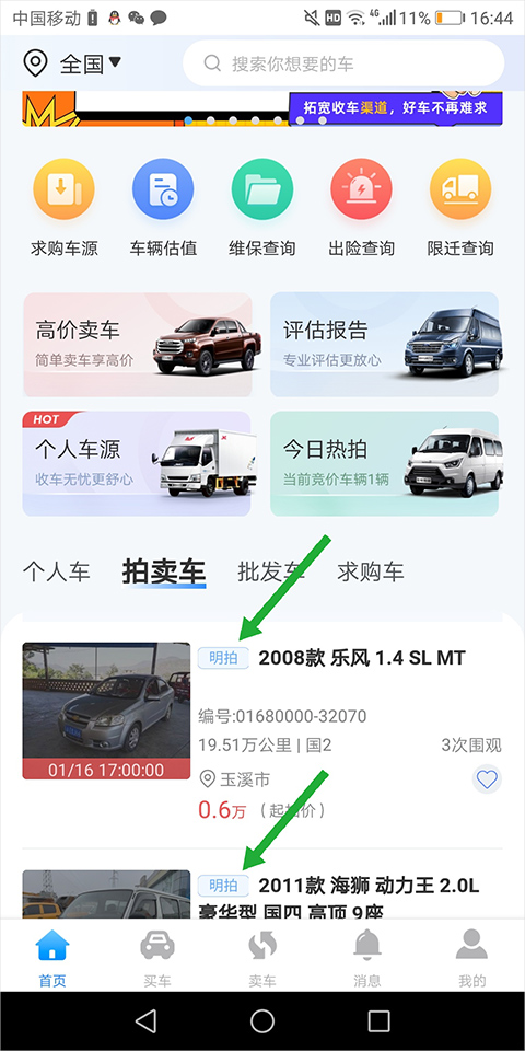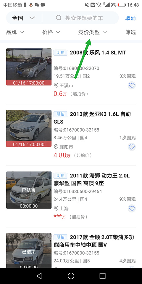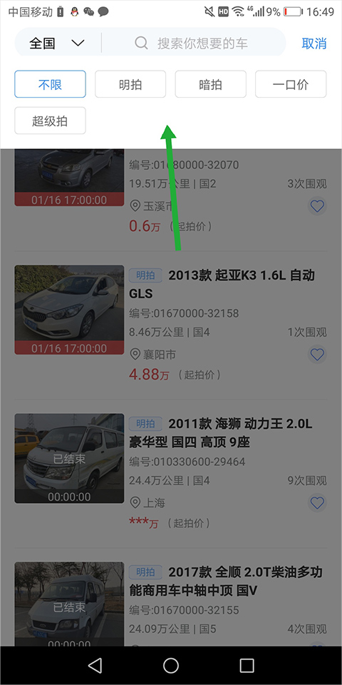 目前平台可以提供明拍、暗拍、一口价、超级拍方式进行拍买。具体的方式用户可以打开优购二手车app进入首页后点击【拍卖车】处查看车源发布方的竟拍方式,下图绿色箭头所指的文本信息就是拍卖方式了