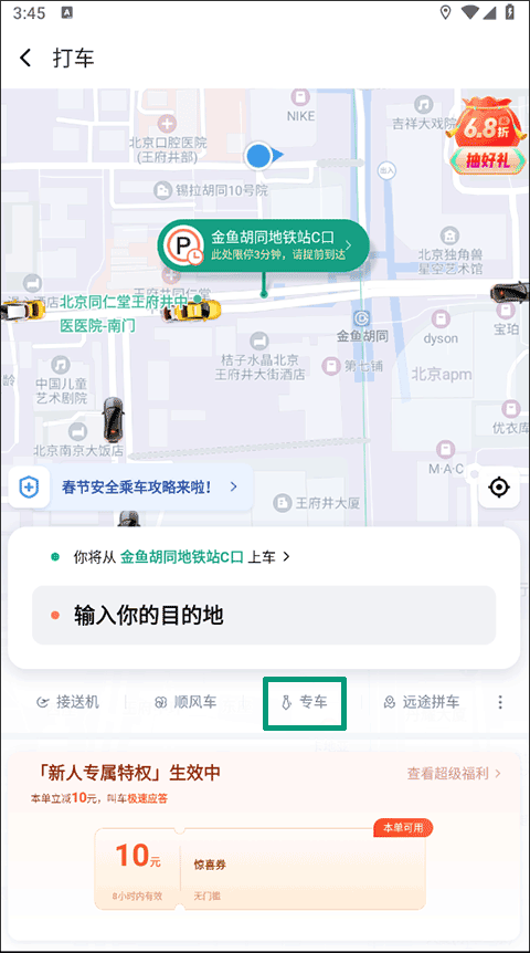 1、打开滴滴打车后选择一种出行方式,然后手动输入自己的目的地。