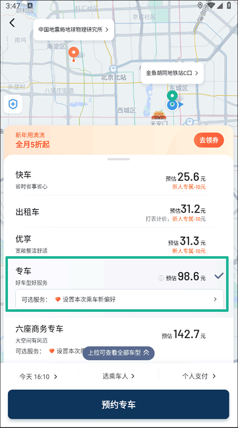 6、最后在预约的最后环节中找到并点击“专车”服务选项后,点击预约专车功能按键即可完成专车叫车服务。