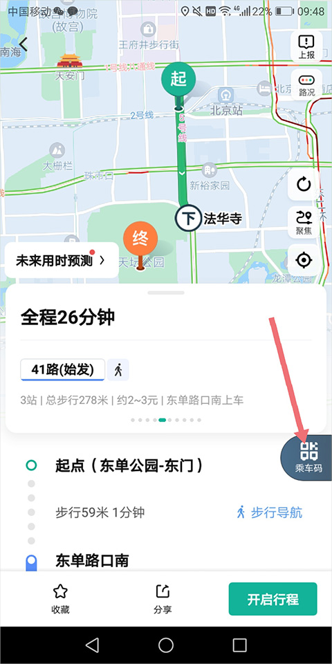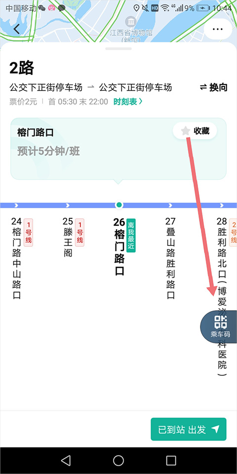 3、线路确定好后,点击进去,可以看到页面右侧靠近底部的地方有个【乘车码】浮动图标(下图红色箭头所指区域),点击该图标即可打开微信乘车码进行扫码支付