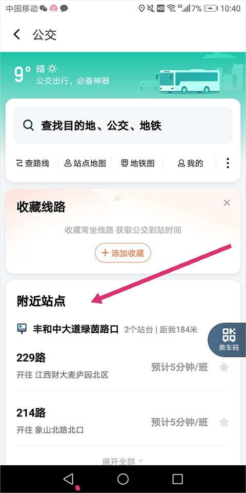 1、用户进入到软件页面后,在附近站点处,选择要乘坐的公交线路
