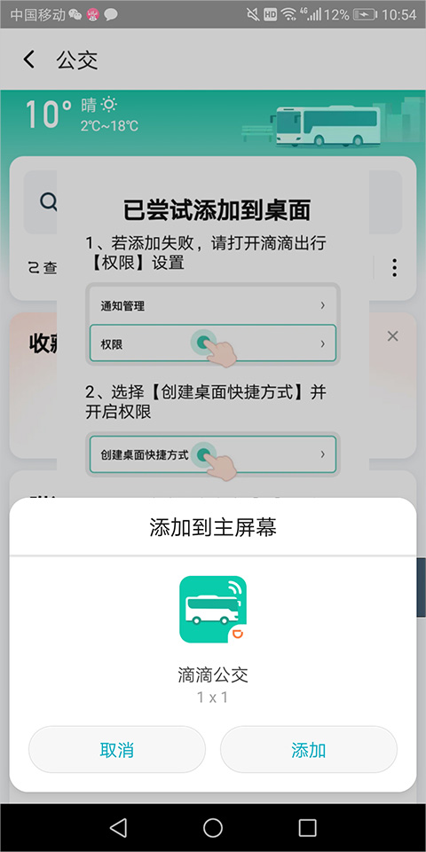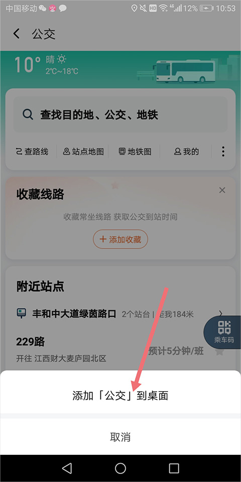 2、在页面底部弹出的选项框中点击【添加公交到桌面】