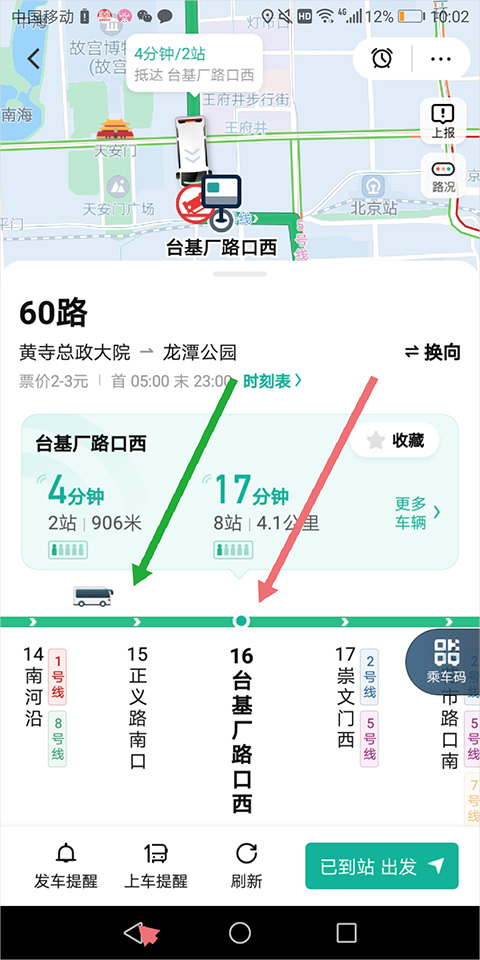 2、点进去即可查看公交车(下图绿色箭头所指代表公交当前所在站台)距离站台(下图红色箭头所指代表用户所在站台)的信息了