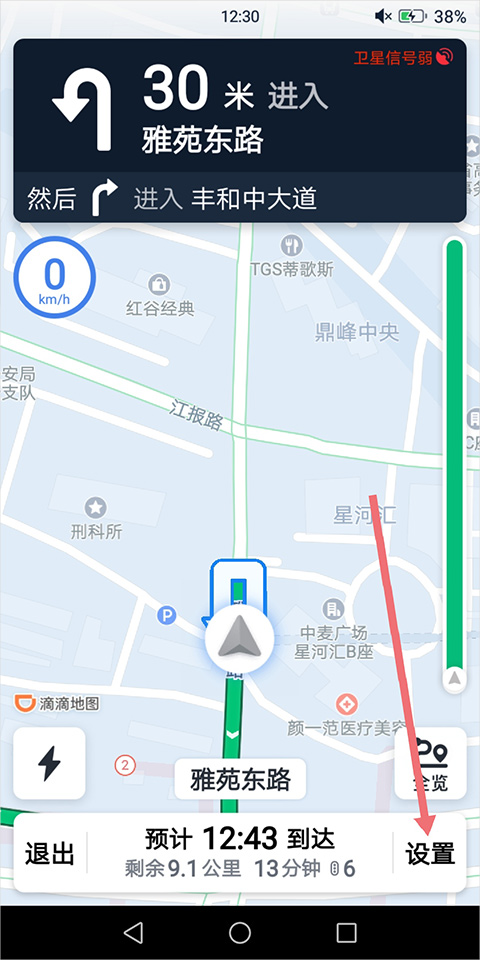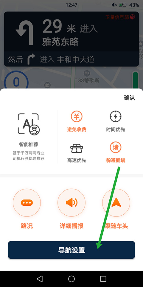 1、用户确定好导航路线后,开始导航时,可在导航服务页面中点击底部右下角【设置】(下图红色箭头所指)