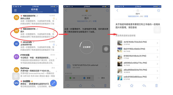 不同于其他邮箱的最大特点,使用商务密邮发出的加密邮件需启动特定的解密流程使得邮件最终解密后方可查看,用户可使用软件直接对邮件自动解密,也可使用其他第三方邮件客户端进行在线解密。