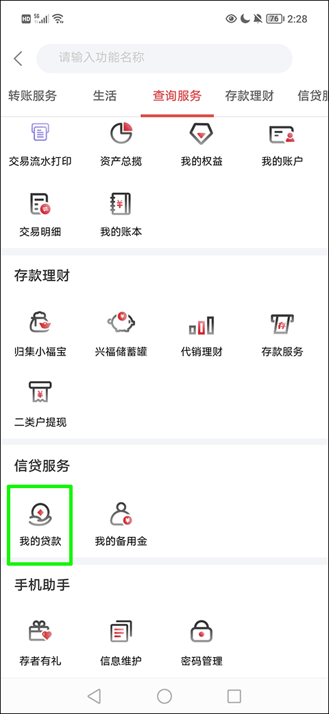 2、在这个界面中的信贷服务中找到并点击“我的贷款”选项;