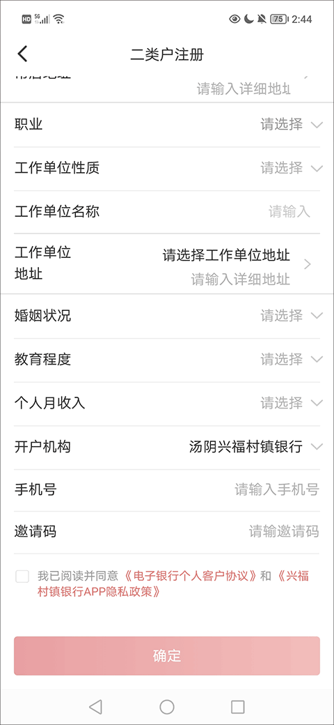 4、在二类户注册界面填写好自己真实信息后点亮红色方框内的内容;