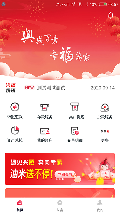 用户可以通过暖色的首页界面,对应用有个大概的了解,在财富界面,突出的存贷业务,让客户能够对订制化产品产生期待。而个人管理中心中的资产总览和交易明细,为客户提供清晰的财务管理服务。有需要的用户就快来下载这款应用吧。