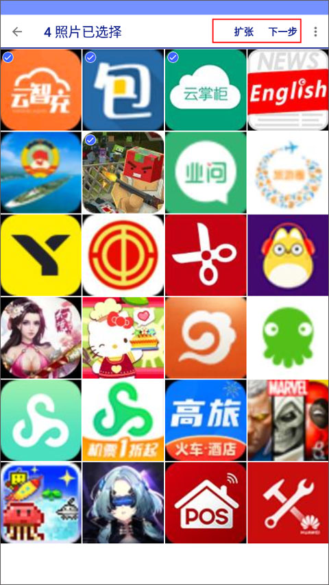 2、进入到本地内存中选择你想要打印的照片,将“选择”按钮切换成扩张,批量选择多张图片,并进入下一步。