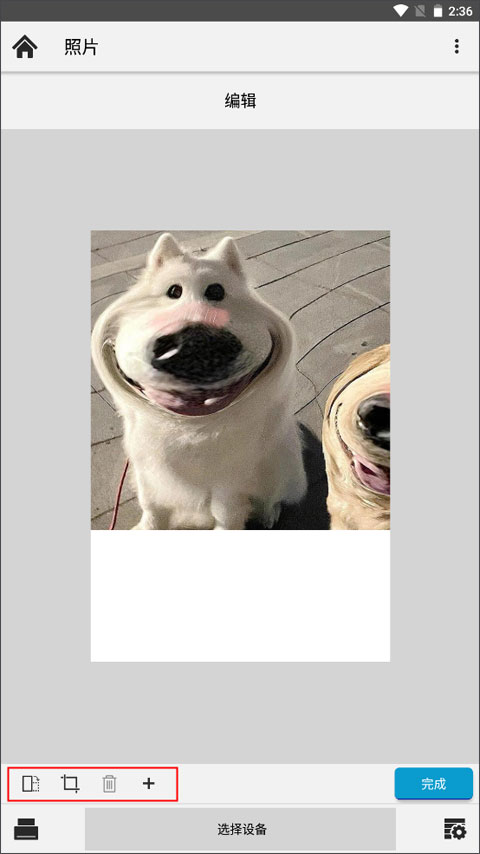 (2)借助编辑功能,您可对图片进行大小调整、横移、旋转和剪裁。您还可使用+按钮并从设备选择图像,将额外的图像添加至相同的“画布”,最多可添加7个额外图像。垃圾桶图标可让您删除所选的添加至画布的图像。在您完成编辑之后选择完成。
