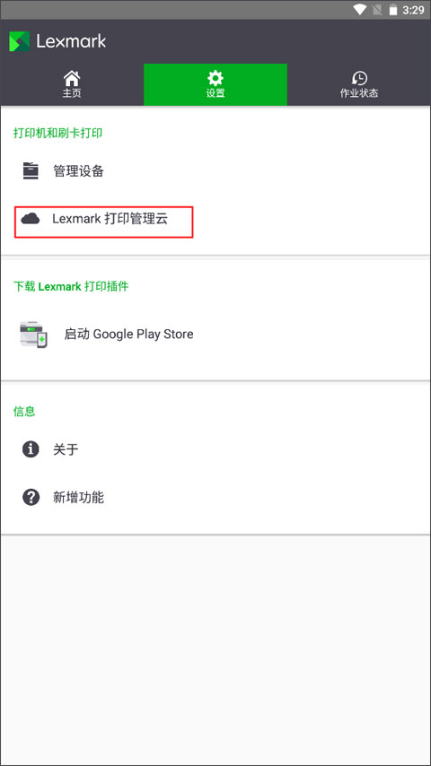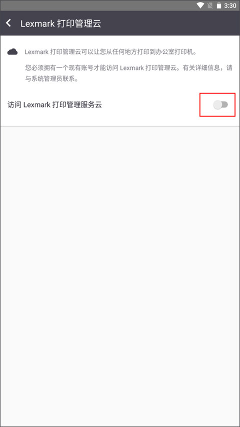 2、Lexmark打印管理云可以让您从任何地方打印到办公室打印机。但是如果您想要使用它,必须拥有一个现有账号才能访问。选择红色框框选中的按钮开启这项功能服务。