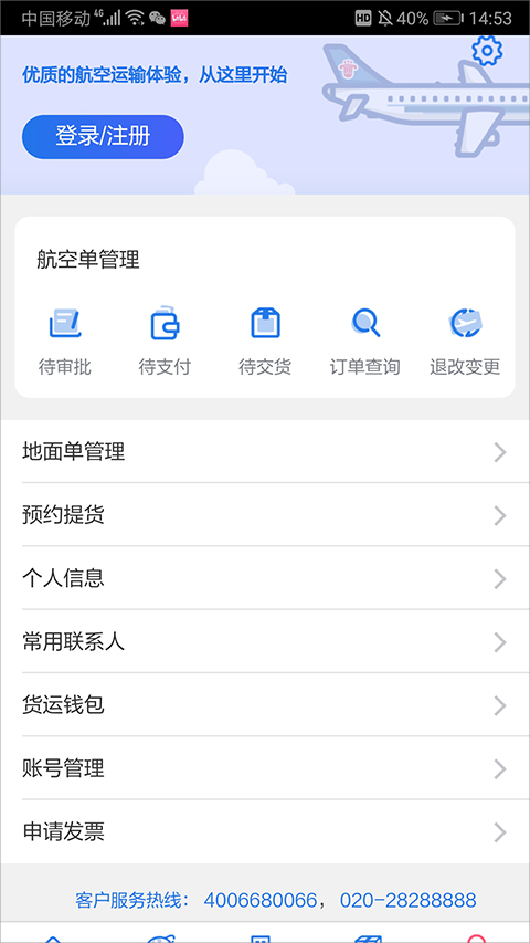 进入【我的】页面中,用户登陆注册、个人信息、货运钱包、发票申请等个人信息管理和操作都可在这里进行