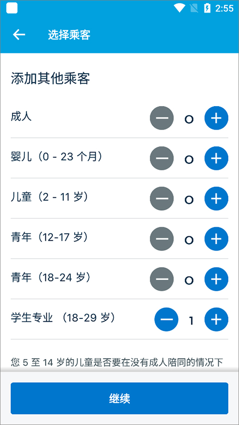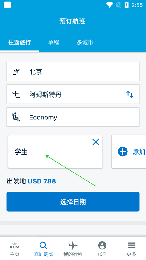 3、然后应用会返回到购买机票页面上,此时就显示为学生类型的乘客