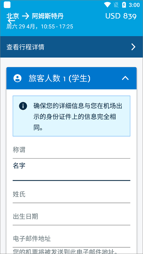 选择一个航班并在荷航应用程序中预订机票。您想为将来的旅行节省时间吗? 将您的个人详细信息直接保存到您的个人资料中。更妙的是:还可以使用智能手机扫描您的护照,一次上传您的所有联系信息。