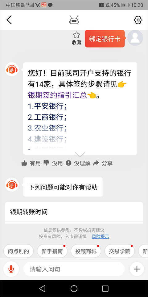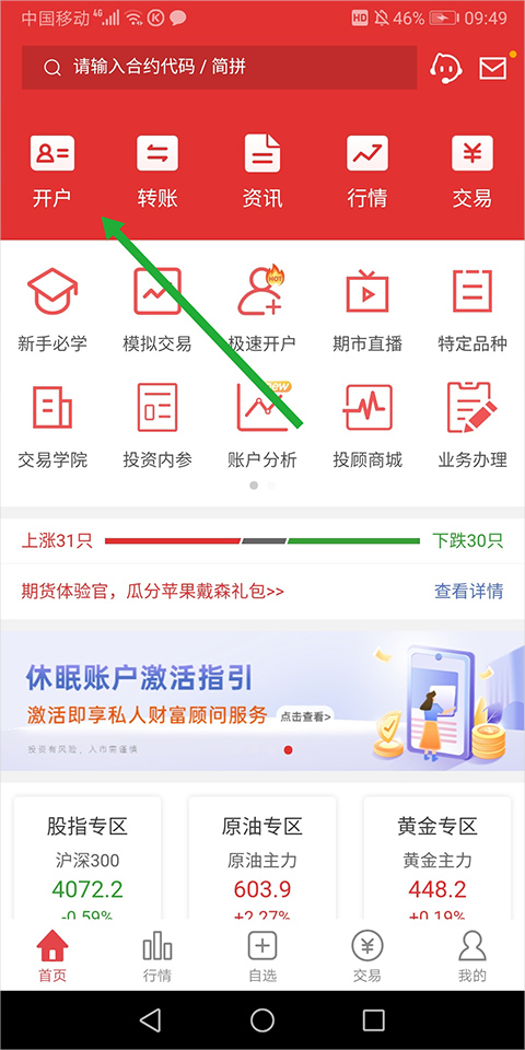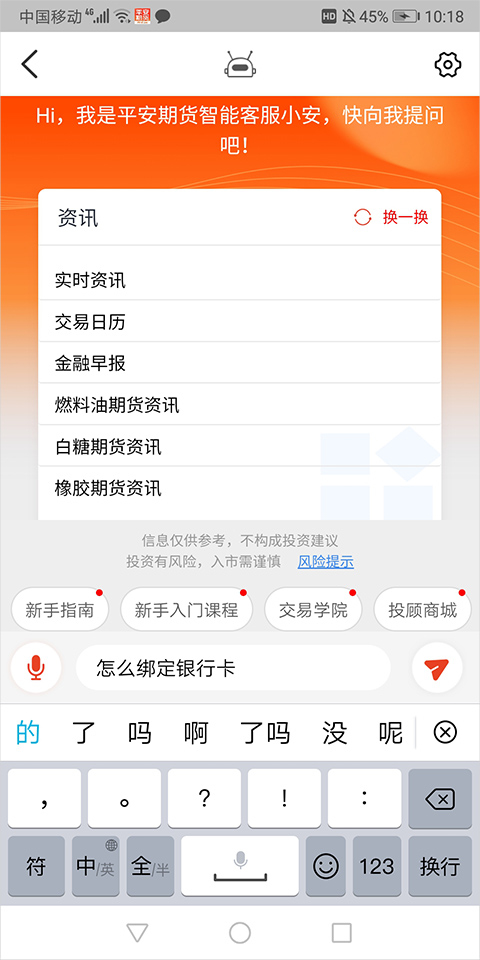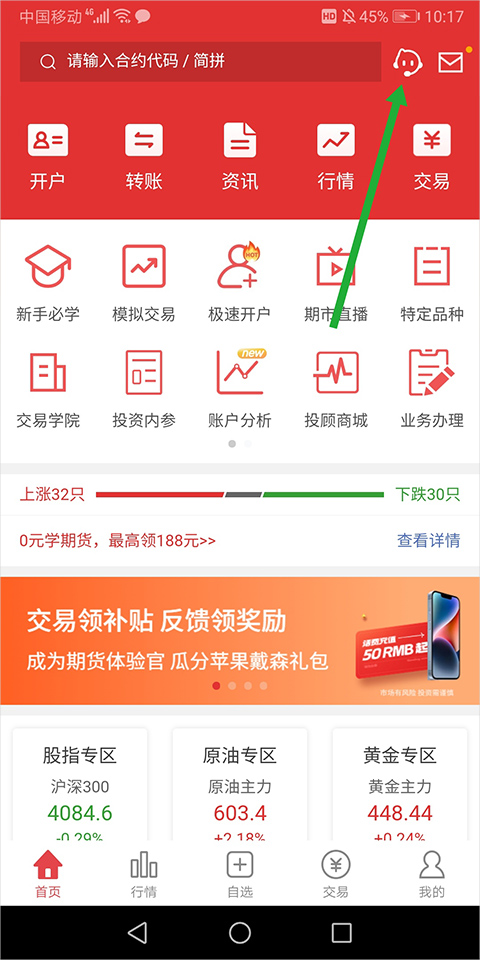 绑定银行卡是要区分不同银行的,不同银行的绑定方式不同,用户可以进入平安期货app首页点击右上角的客服图标(下图绿色箭头所指)