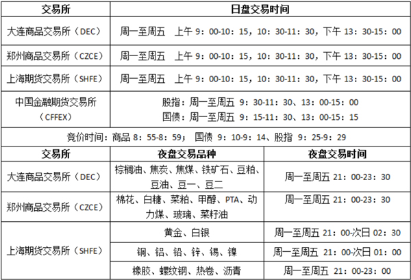 交易时间分日盘交易时间和夜盘交易时间,而且可根据不同交易所进行详细划分,具体交易时间如下表所示,