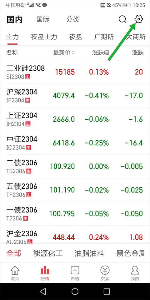 用户进入平安期货行情页面中点击右上角的设置图标(下图绿色箭头所指)