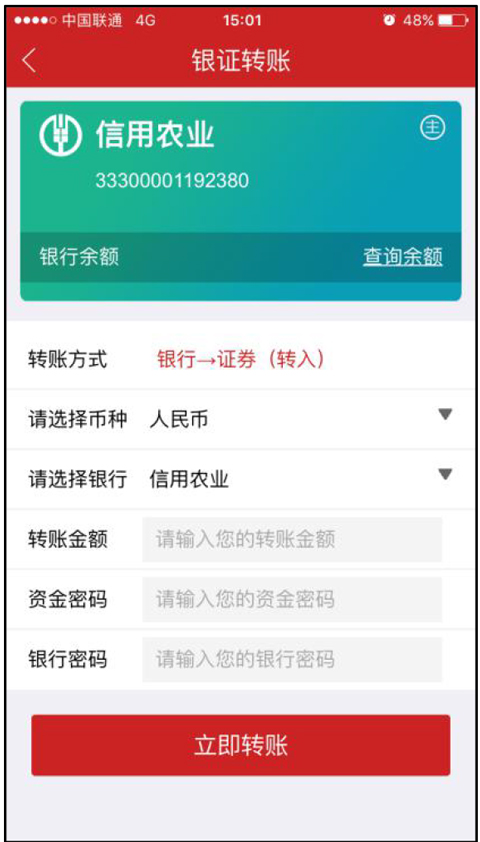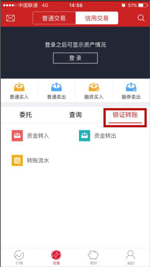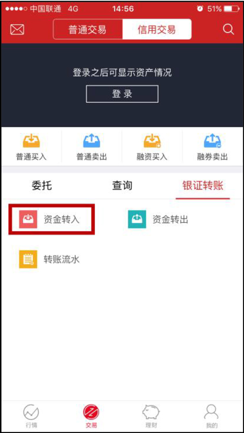 2、进入银证转账模块后点击【资金转入】或【资金转出】
