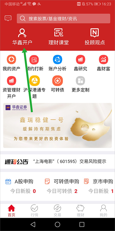 开户前准备好二代身份证和一张银行借记卡,然后打开华鑫证券鑫e代手机app,进入首页后点击【华鑫开户】