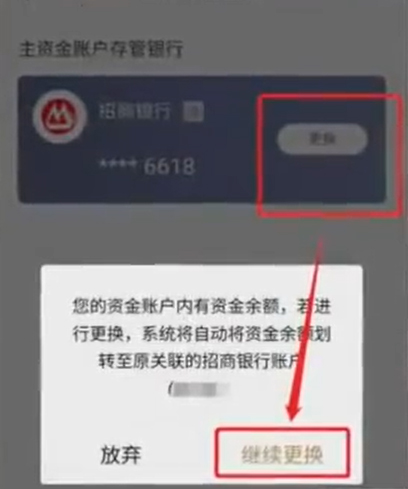 如果银行账户有余额一般会弹出提示框,用户在这里一般点击【继续更换】