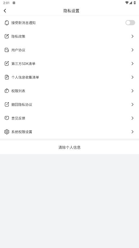 4、在隐私设置里面你可以打开接收新消息通知的权限接收流量使用情况的通知,当然你还可以点击下方的清除个人信息进行个人信息的清空。