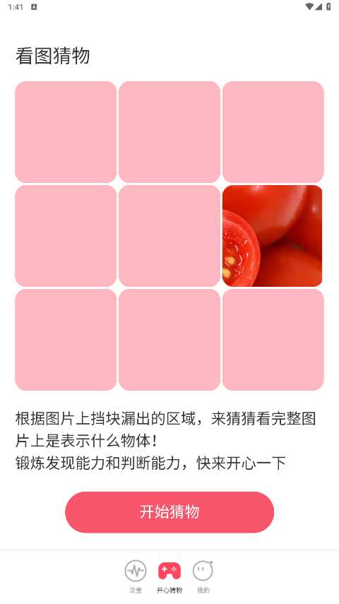 2、这款软件还带有休闲游戏娱乐功能,真是一款特别的软件,进入开心猜物界面,根据图片上挡块漏出来的区域,猜猜看完整图片上表示什么物体,可有效的锻炼用户发现能力和判断能力。
