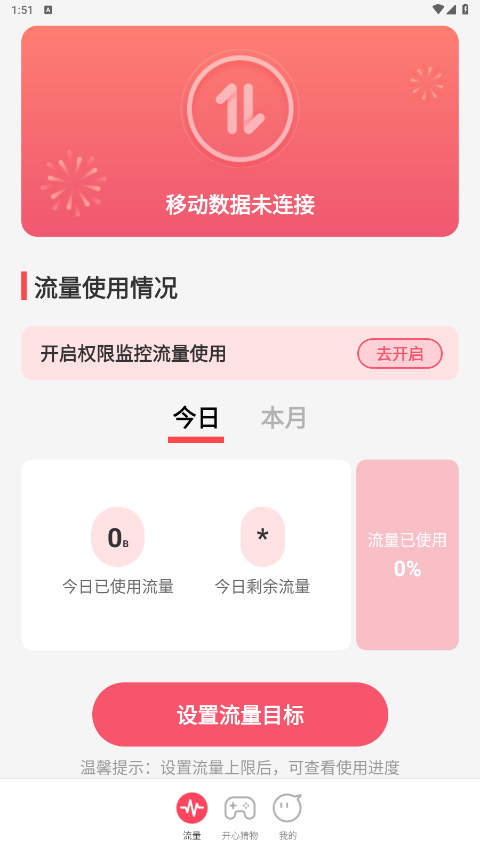 1、在多多软件站下载安装该软件,打开进入流量界面,首先需要用户线进行移动数据的连接,点击上方图片移动数据即可连接。下方还有一个流量使用模块功能,可点击开启监控流量使用的权限,然后点击设置流量目标可设置今日和本月的流量上限。当这些设置都完成,你就可以实时查看流量使用进度了,如果今日或者本月流量上限快达到,系统还会弹出消息提示,这样你就可以有计划的避免流量超出产生的额外话费了。