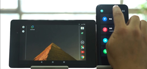 手机同时驱动手机屏和中控屏,自动适应中控屏分辨率。中控屏显示驾驶功能,手机屏正常操作其他应用,支持手机锁屏
