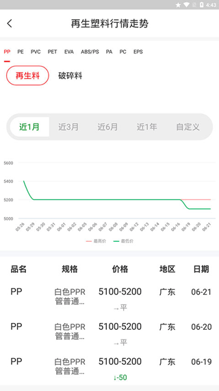 3、点击”行情走势“后,即可查看某一类材料近一段时间内的行情趋势。