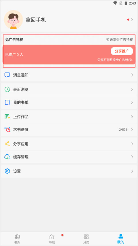 1、打开app并进入到主界面,这时候需要先点击下方的【我的】按钮,上方提示了免广告特权,点击上方的分享推广。