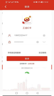 用户注册成功后,即可在“工会E卡App 进行登录,除密码外也可选择手机验证码或绑定个人微信登录