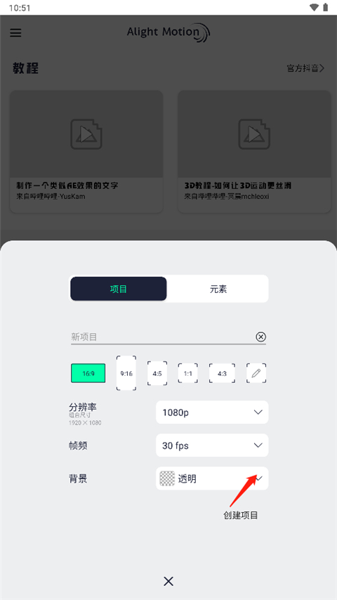 2、可以设置项目名称、宽高比例、分辨率、帧速率、背景颜色;