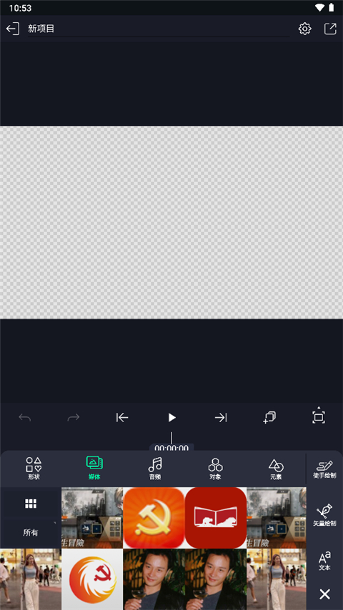 5、可以添加形状、文本、媒体(手机上的图片和音乐还有视频)、图纸、元素;
