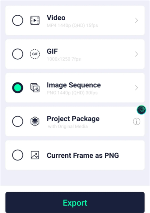 7、支持多种导出格式,包括MP4视频、GIF动画、PNG序列和静止图像,同时还可以允许他人查看您的项目包,使用纯色和渐变填充效果,并自定义字体。同时支持在图层之间复制和粘贴,以及列出喜欢的作品,方便用户在不同项目中进行重复使用。