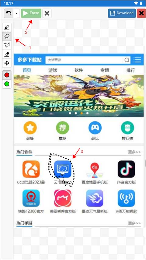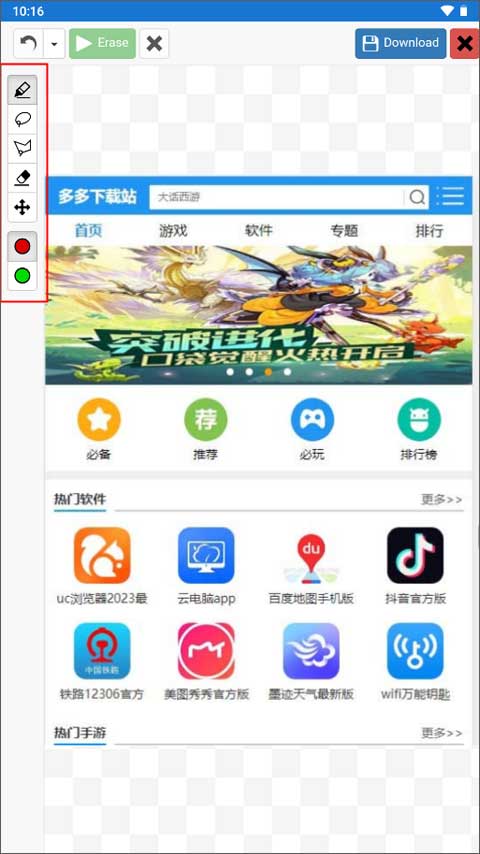 4、工具使用操作就是先选择好工具,然后点击上方的“Erase”才能操作,点击这个按钮之后就可以在图片编辑区域设置了。