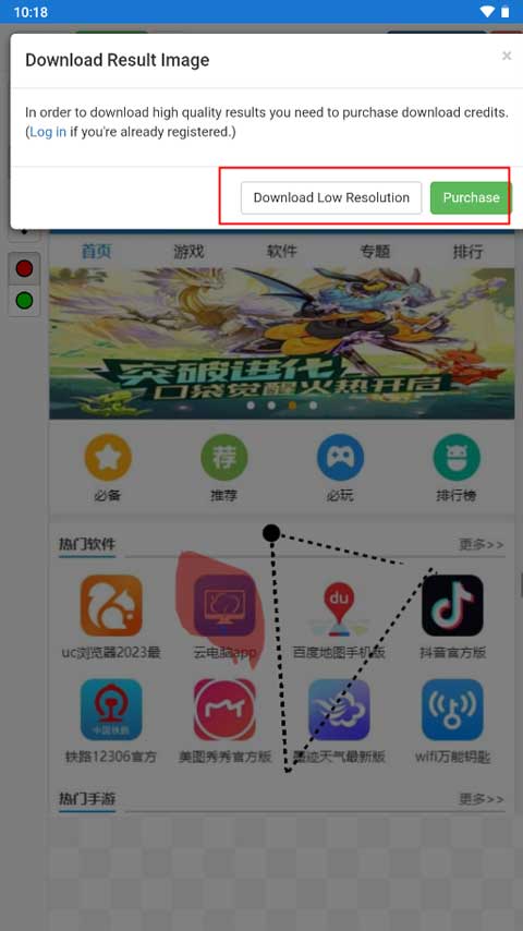 5、将图片编辑好后,点击右上方的“Download”保存图片,这时出现下拉提示“为了下载高质量的结果,你需要购买下载积分。(如果您已经注册,请登录。)”。