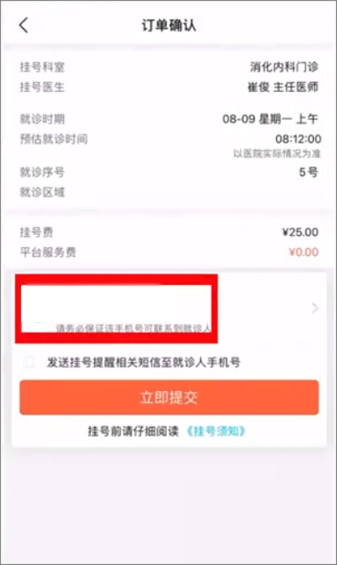 5、确认挂号订单,添加就诊人信息,输入联系方式,点击提交缴费即可预约成功。