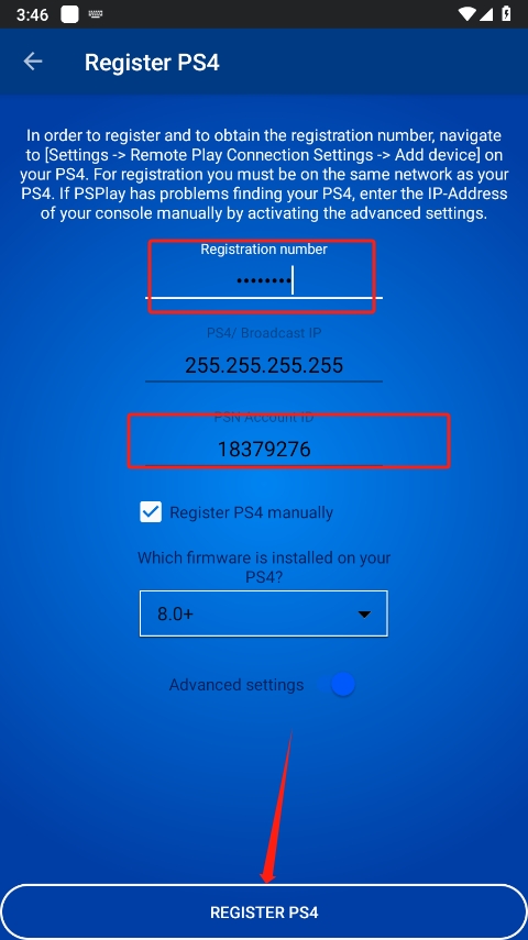 在您的PS4上导航到设置-远程播放连接设置并激活“启用远程播放”复选框。然后转到添加设备,您应该会在其中看到8位注册号。