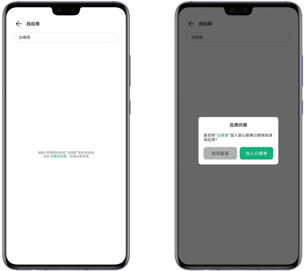 方法一:在“应用页”内,未搜索到该应用时,可根据提示将该应用添加至心愿单,可加快出境易收录该应用。