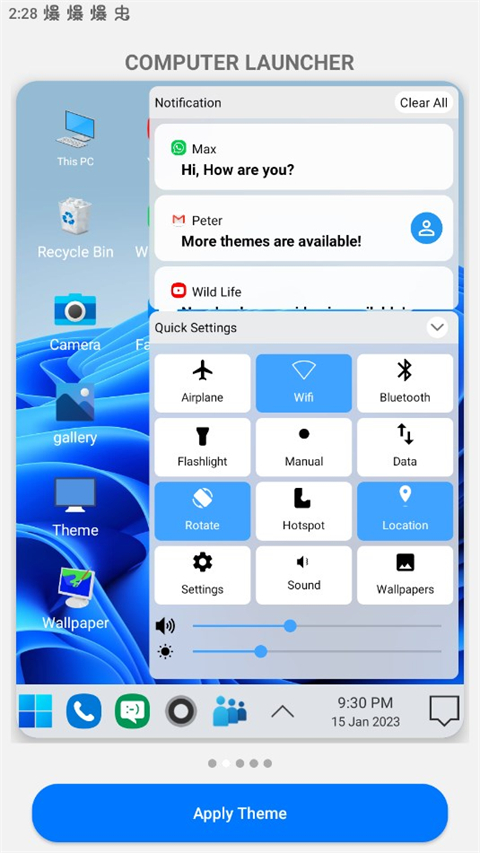 win10启动器手机版是一款支持安卓手机使用Windows10系统主题的辅助工具,英文名叫Win 10 Theme,通过这款启动器我们就可以在自己的手机上设置成电脑主题,享受不一样的操作体验。在设置电脑主题的同时,软件还会将不同的屏幕的应用图标全部换成电脑应用图标,就连左下角的功能菜单也是完美还原,保证用户可以在手机上体验到原汁原味的电脑操作。