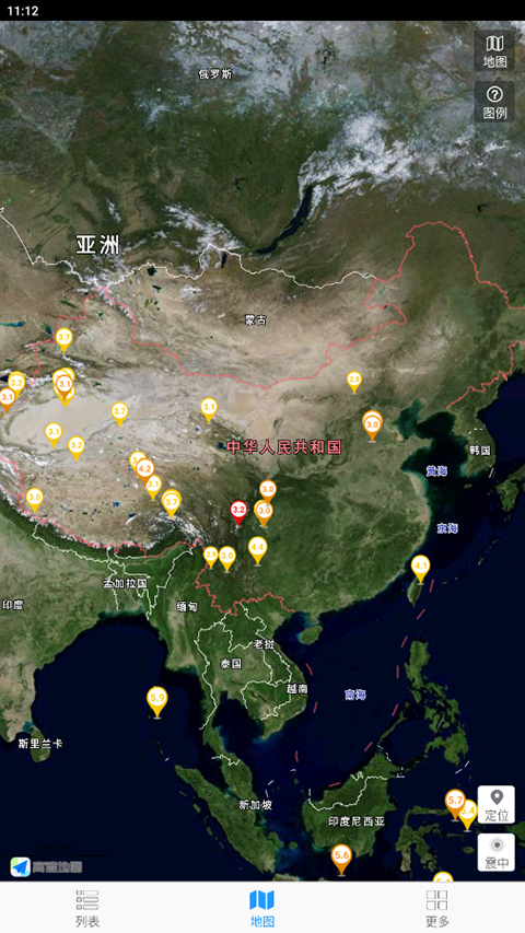 3、地震列表上的所有地震可以定位到地图上,震级大小和发震时刻通过标注符号区分;