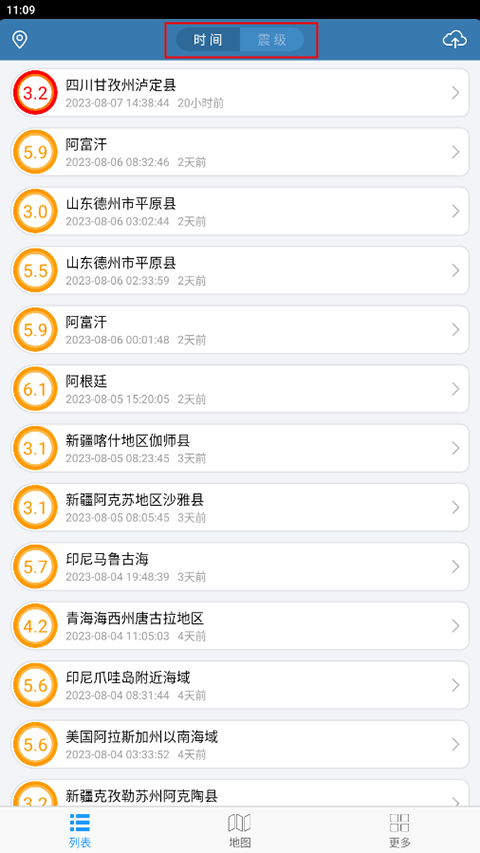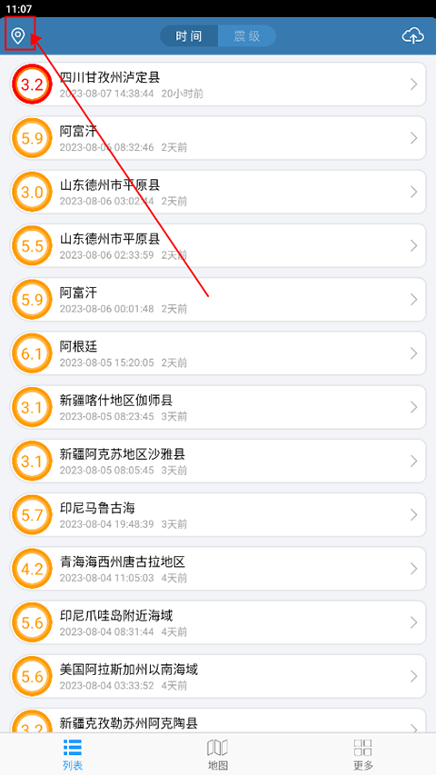 1、在“列表”页面,找到想要看信息的地区,可以根据时间和震级查找;