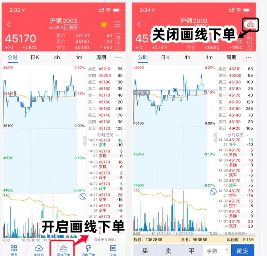 第一步:打开行情详情页,最下方菜单栏里点击“画线下单”按钮。
