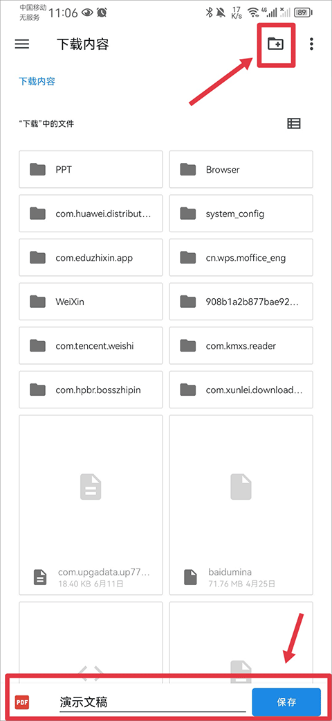 4、存储后在手机文件管理器中打开该文件夹,就可以查看演示文稿的pdf文件了
