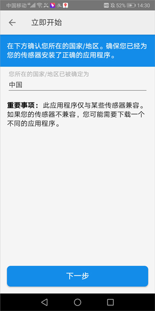 造成该现象的原因是:此应用仅与某些传感器兼容,如果您的传感器不兼容,您可能需要下载其它不同的应用进行使用,下图是应用官方的提示信息截图画面