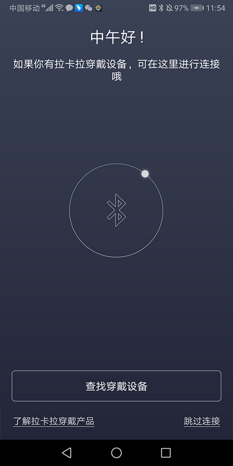 然后让用户查找穿戴设备,这一步用户要打开手机蓝牙,进行连接设备即可,连接全过程是自动的