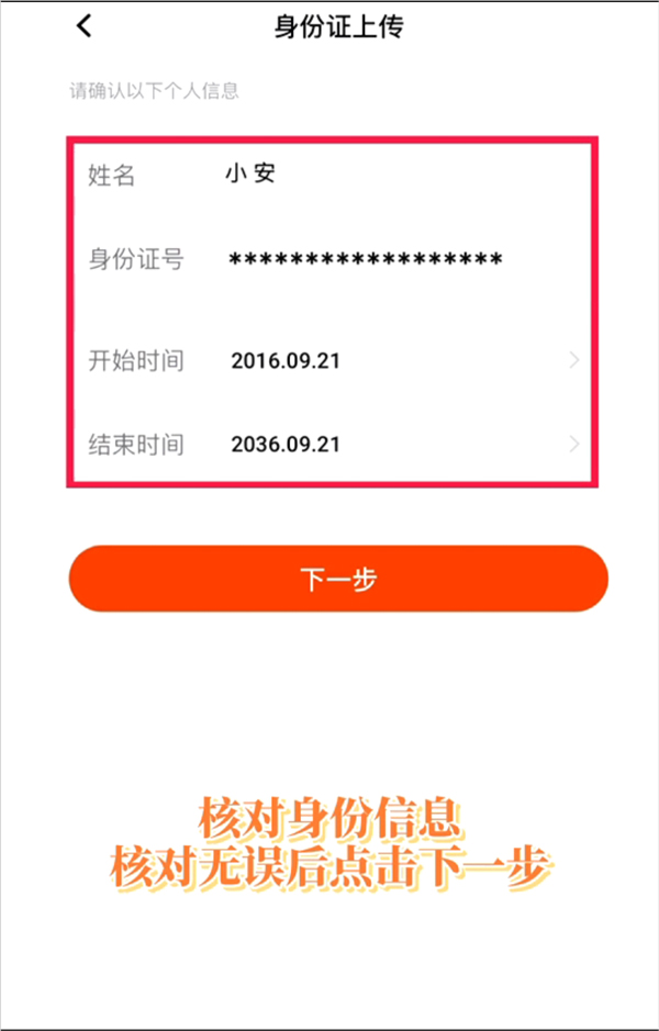 7、上传成功后核实证件信息后点击【下一步】