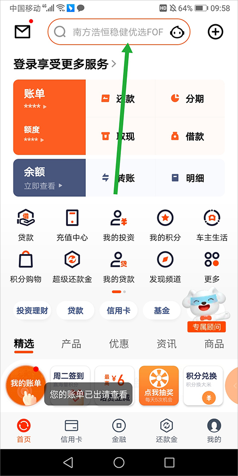 1、打开口袋银行进入页面后,点击页面顶部的搜索框