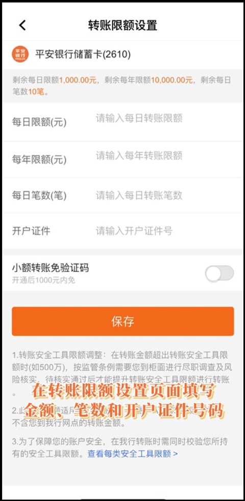 4、在打开的转账限额设置页面中填写金额、笔数和开户证件号码等信息后提交即可
